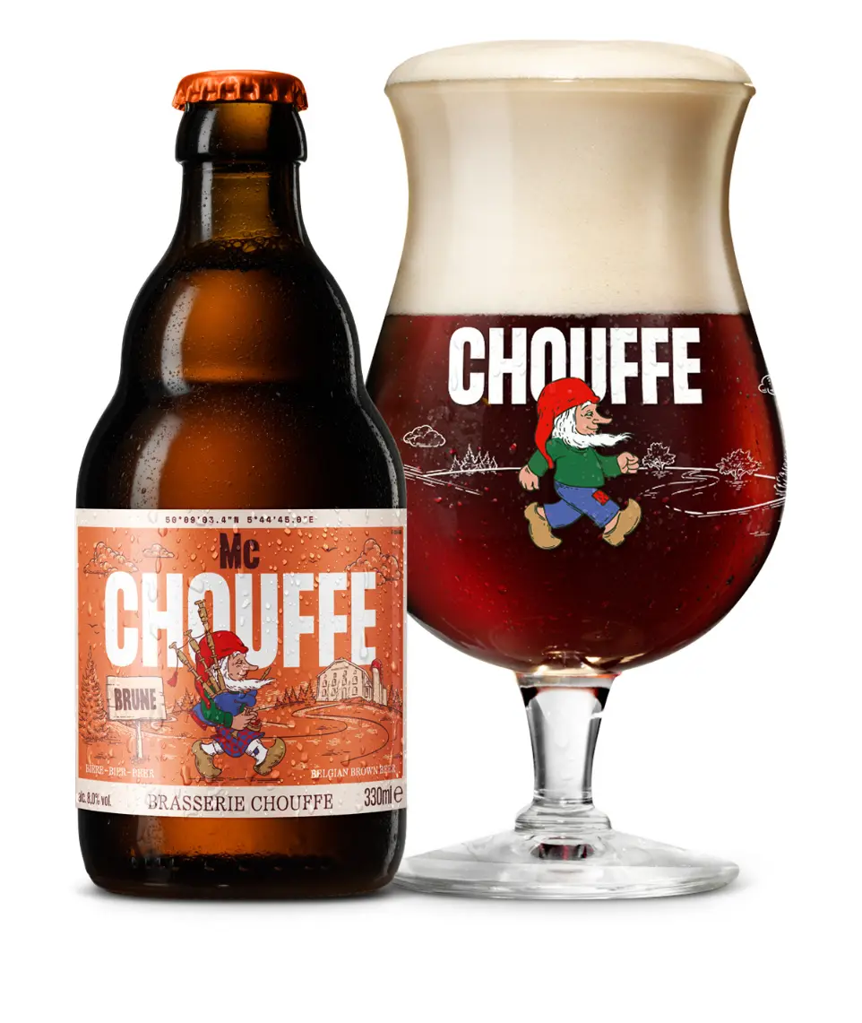 Llena de carácter, Mc CHOUFFE deleita a los amantes de la cerveza oscura. Su sabor característico, su color rubí oscuro y su fina capa cremosa la convierten en una cerveza premiun. Tiene sabores especiados a anís y regaliz, complementados por notas de caramelo con mucho cuerpo. A pesar de su robustez, Mc CHOUFFE es sorprendentemente suave, lo que la hace muy especial entre la cultura cervecera belga.